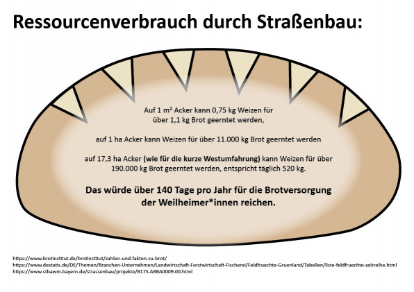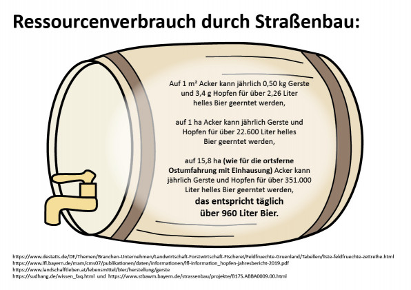 Das Staatliche Bauamt gibt den Flächenverbrauch der „Ortsumfahrung ortsnah mit langem Tunnel“ mit 6,8 ha an. Aus dem Vergleich mit der vollständig offenen Variante (13,4 ha) ergibt sich: Nur 49 % sollen untertunnelt werden, mehr als die Hälfte verläuft oberirdisch! Zusätzlicher Flächenverbrauch für eine „Erschließungsstraße“ auf dem Tunneldeckel und die Verdichtung landwirtschaftlicher Böden ist dabei wohl noch gar nicht berücksichtigt.
