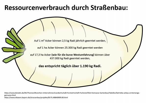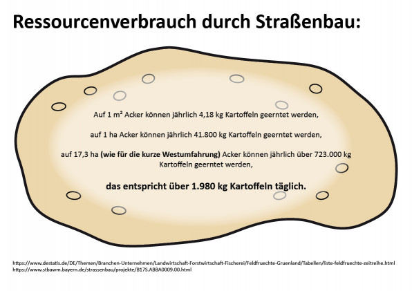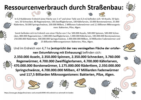 Abgesehen vom direkten Flächenverbrauch, wirkt eine Umfahrung stets auch als Türöffner für weiteren Flächenfraß, indem neue Gewerbegebiete erschlossen werden, die Zuzug generieren, der wiederum neue Wohnbebauung erfordert und neue Infrastruktur in Form von Supermärkten, Schulen, Sportstätten, Krankenhäusern und wieder neuen Straßen. Dieser Kreislauf führt zu Naturzerstörung, Artensterben, Bodenversiegelung und dazu, dass wir uns immer schlechter regional mit Lebensmitteln versorgen können.
