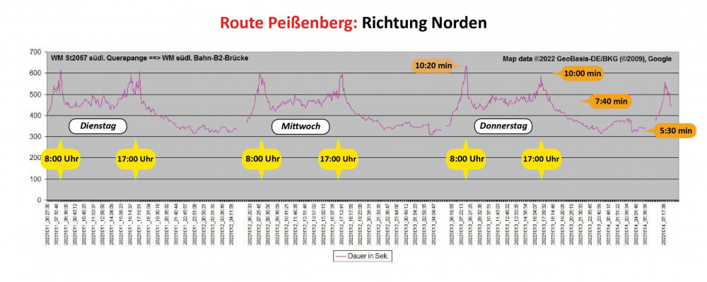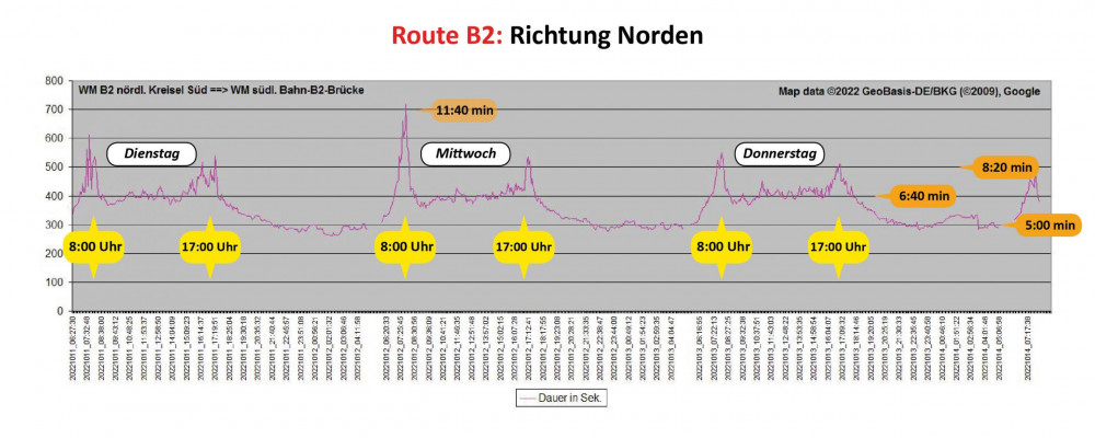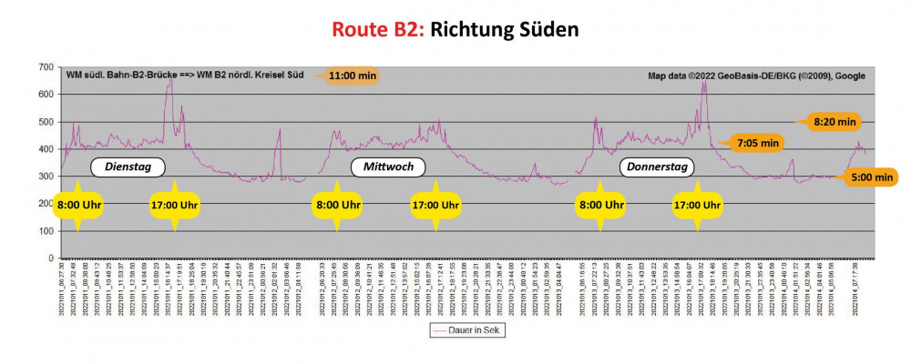 Untersucht wurden die Verkehrsdaten an drei Werktagen im Oktober 2022, ohne Schulferien, Umleitungen oder andere besondere Ereignisse.